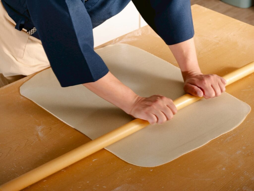 粉の鮮度が違うからこそ、打ち上がりの香りが格段に違います。蕎麦粉の香りを感じながら生地をこね、麺棒でよく延ばし、包丁で均等に切る──。