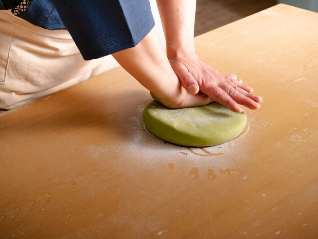混ぜる、こねる、伸ばす、切る、と一つ一つ丁寧に手打ちで極上の抹茶蕎麦を作ります。