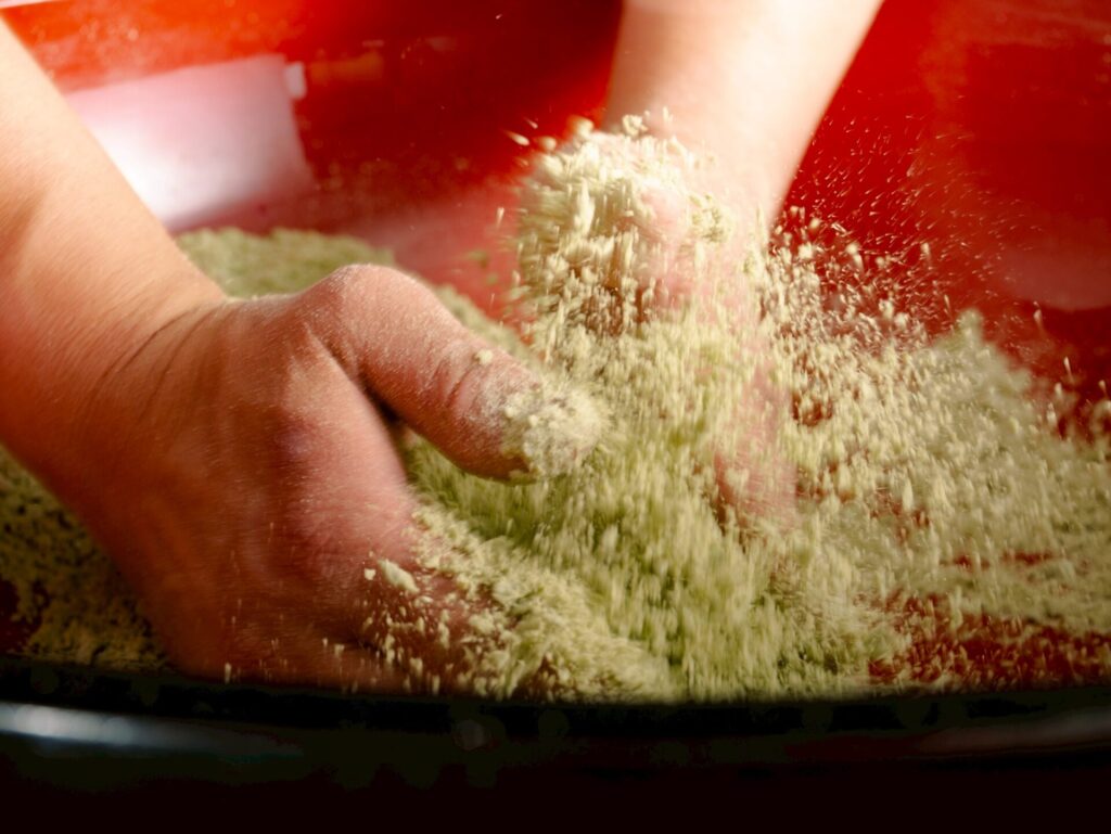 鮮やかな抹茶の緑、白い打ち粉、朱色の木鉢。手に伝わる粉の感触と香りが心を静かに解き放ちます。