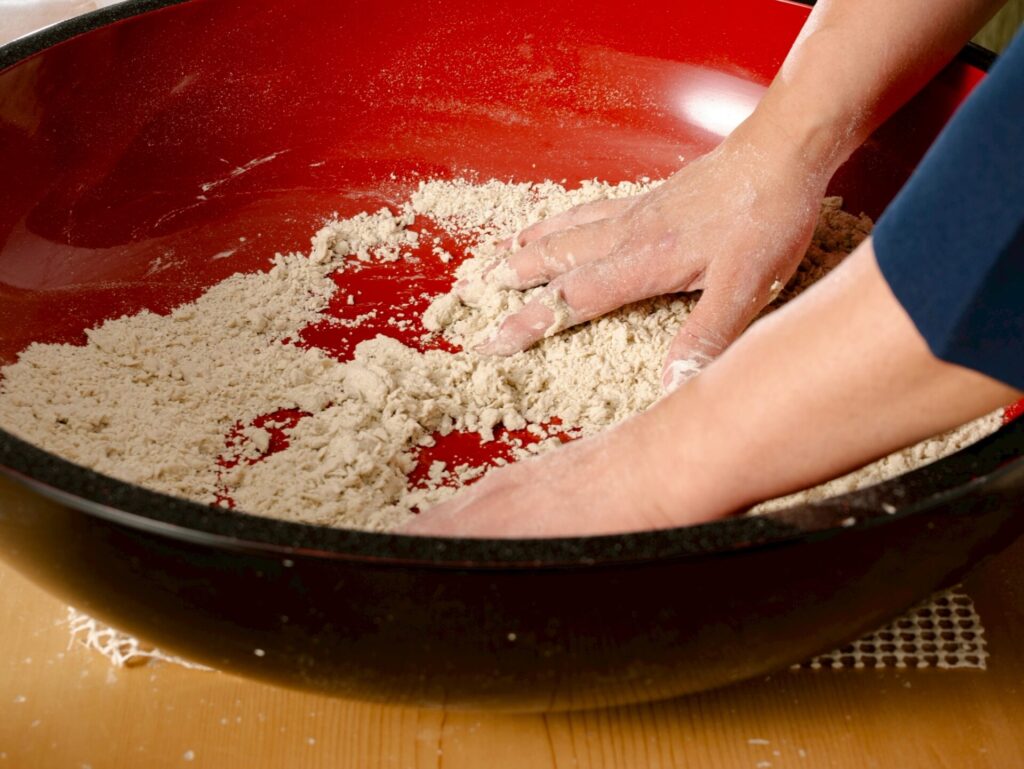 自分で挽いた粉を加えた特別ブレンドで蕎麦を打ちます。こね・延ばし・切りまで一連を体験し、職人の技とリズムを学びます。